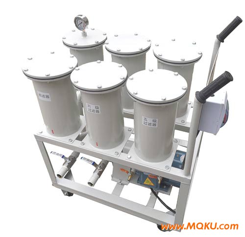 LJL精密滤油机设有六级逐级加密的五层加强型精密过滤芯,轻便灵活、操作方便、不用滤纸、不污染场地、能精细过滤油中的各种杂质。是电力、石化、冶金、机械、铁路等各行业对绝缘油、润滑油、液压油、淬火油、清洗油、冷冻油、防锈油、导热油等油品的高精度除杂,手推式设计,移动方便,特别适合于远距离、加油、抽油及过滤使用。整机外形尺寸很小,它除了小型高效、轻便灵活外,还具有装拆容易,清洗方便,使用中不漏油的特点,完全克服了传统的板框式滤油机换滤纸时,不可避免要漏油污染场地的致命弱点。传统的板框压力式滤油机需购买大量的滤纸,还要自己打孔,一次少则换十张,多则数十张,油中含水量较大时则十多分钟就需更换一次,否则,一旦纸被击穿,杂质必将穿过滤纸混入被净化的油中,导致前功尽弃。因其采用寿命极长的精密过滤系统(逐级加密式过滤芯),滤芯表面罩上一层复合材料做的高强度的精密过滤膜,当精滤系统杂质堵塞后,可将其拆御下来清洗后再装上去(可反复清洗使用),使其拆装、清洗方便、省事,工艺独特、操作简单。
